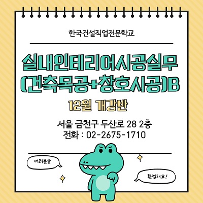 [공지] 독산본점 25년 12월개강!! 실내인테리어시공실무(건축목공+창호시공)B2025.11.05 45 |